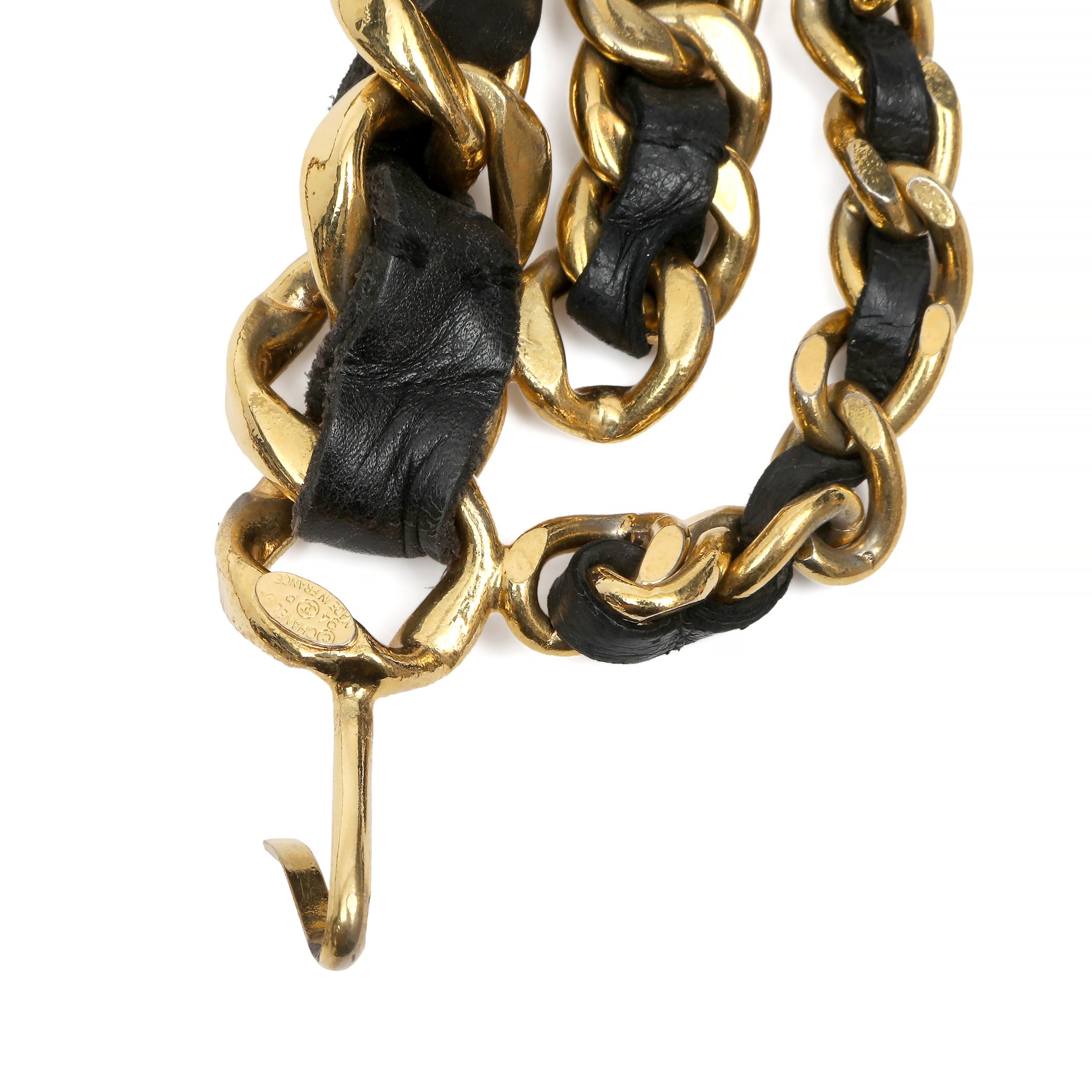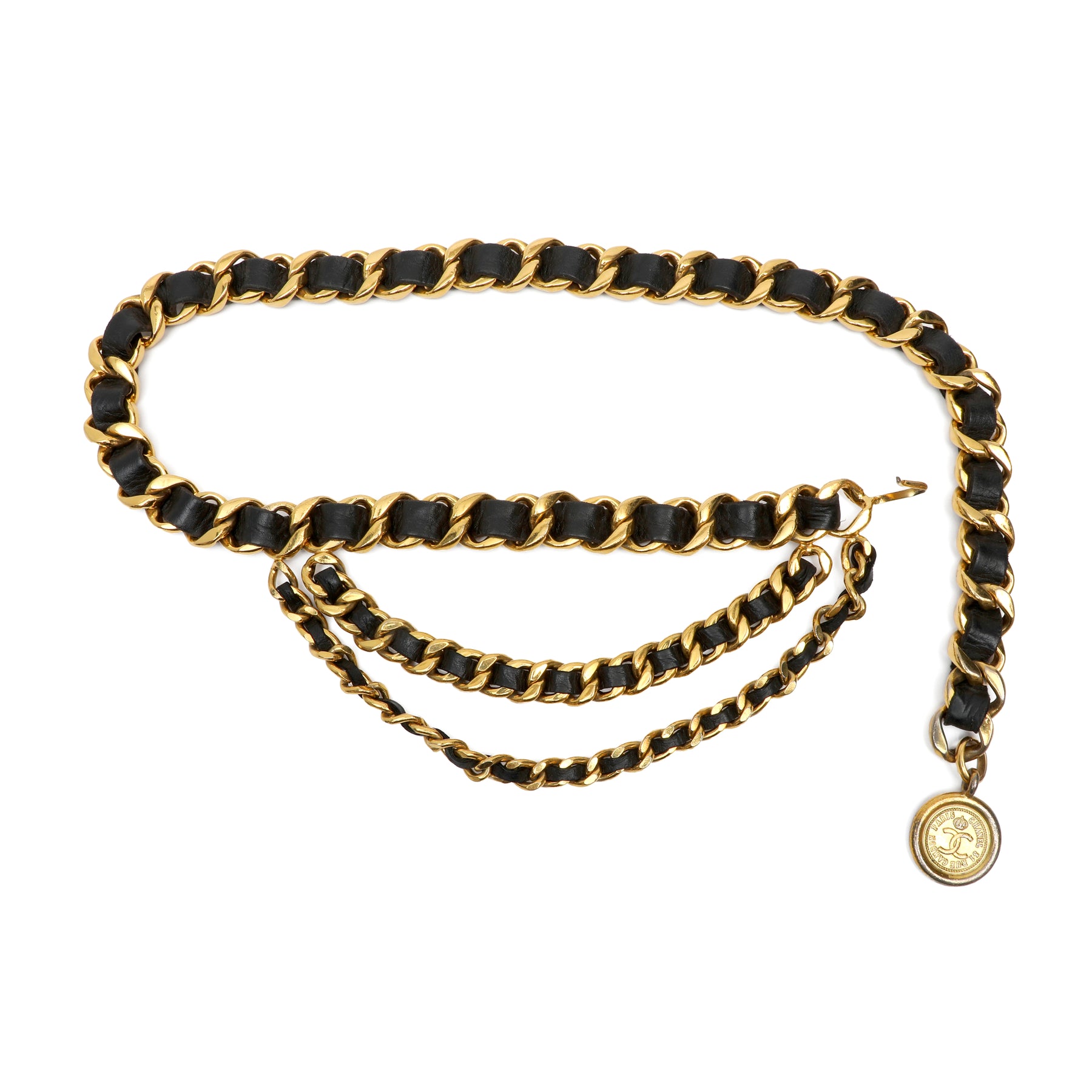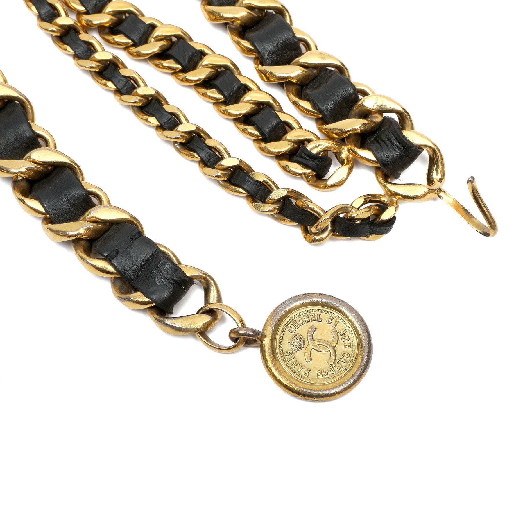 Chanel Gold Chain Blk Leather Belt, CC Medallion Charm