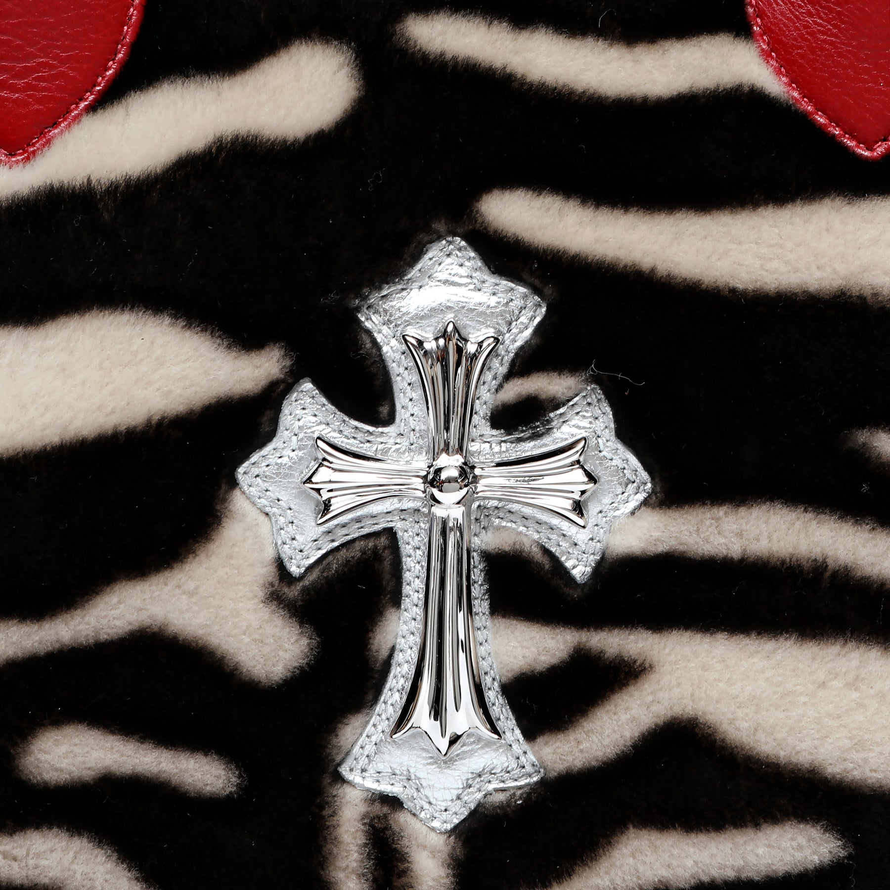 Chrome Hearts Red Leather Cross Patch Mini Shoulder Bag, crafted from a mix of red leather, pony hair, and cow stripe detailing. Featuring the brand’s signature cross patch and bold hardware, this edgy, statement-making bag combines luxury craftsmanship with standout streetwear style.