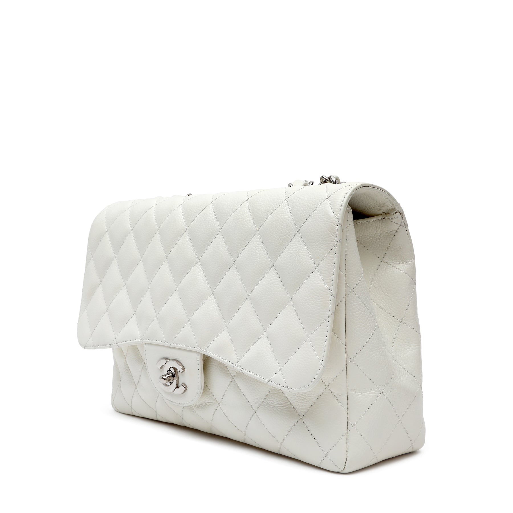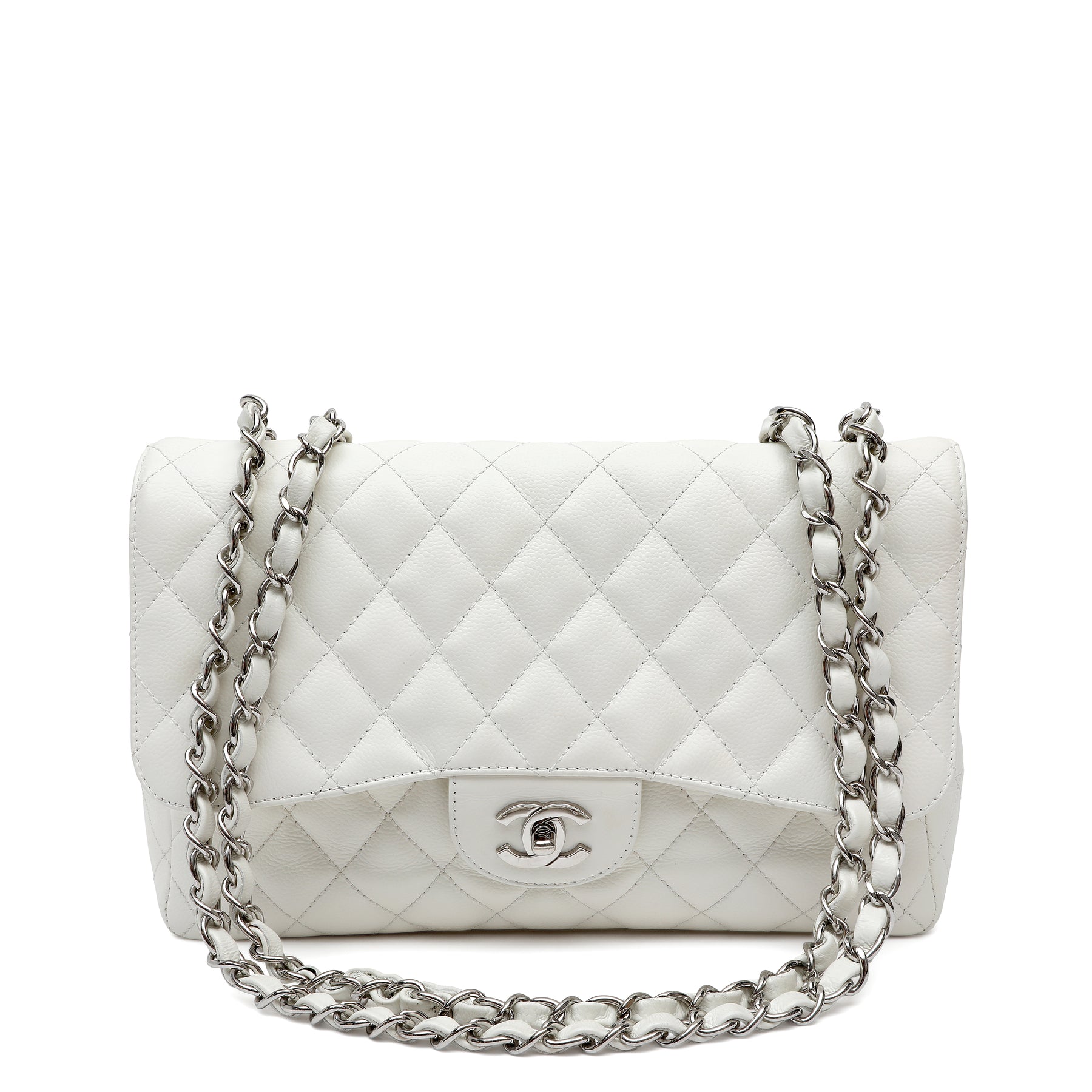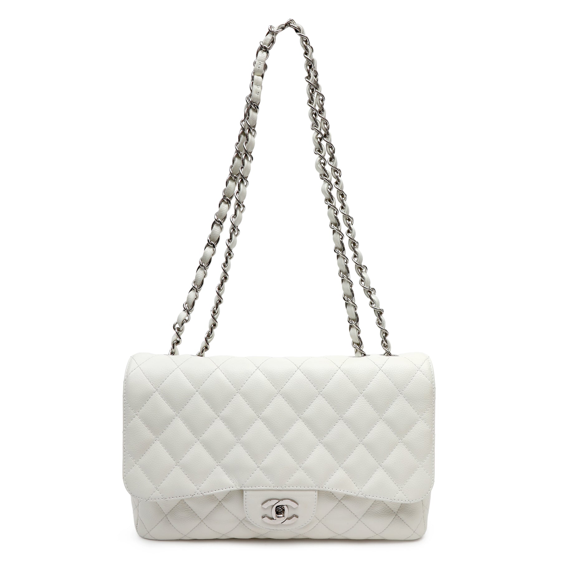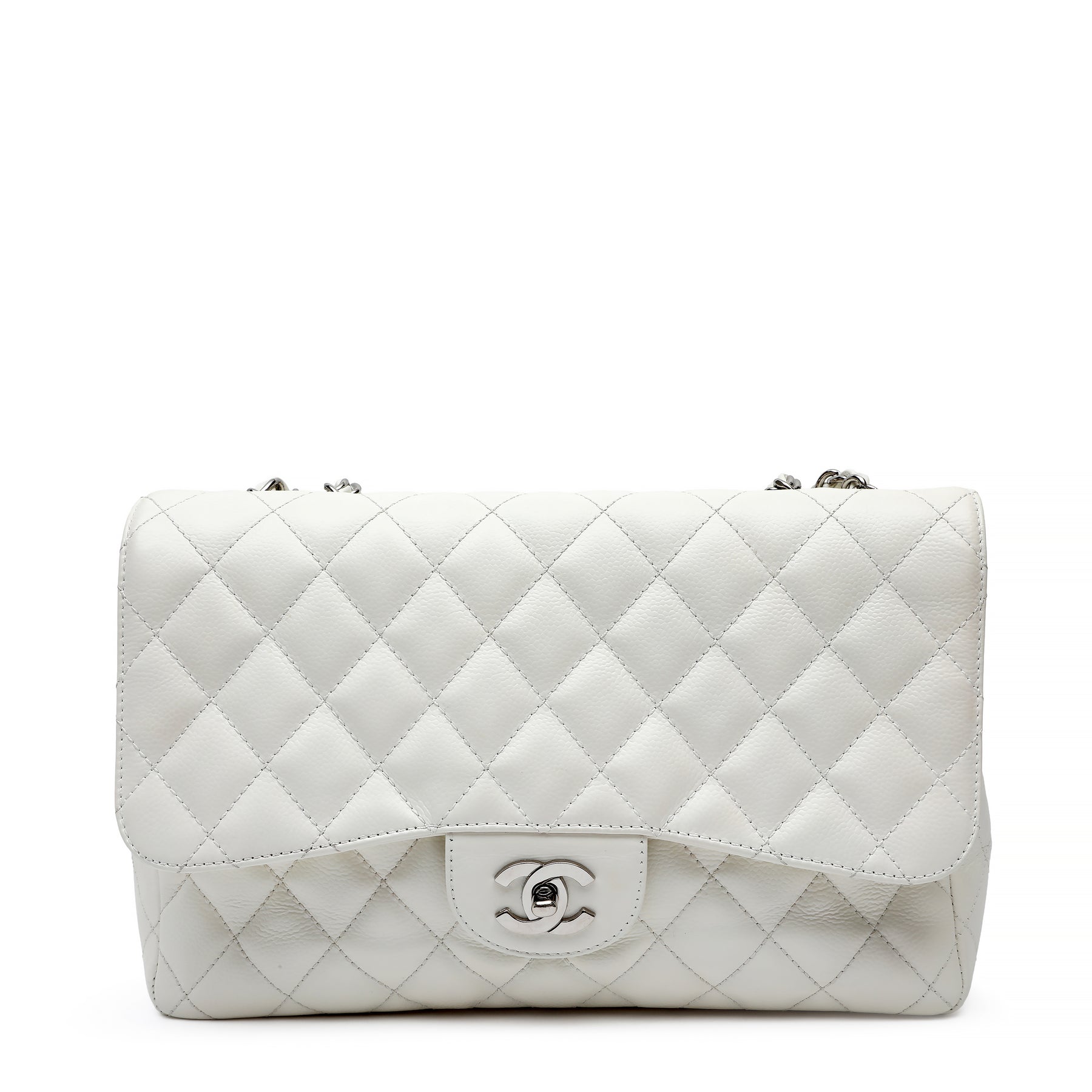 Chanel Classic Single Flap White Jumbo, crafted from smooth white leather in the iconic quilted silhouette. Featuring the timeless CC turn-lock and a spacious interior, this elegant piece offers classic Chanel sophistication with a fresh, refined finish.