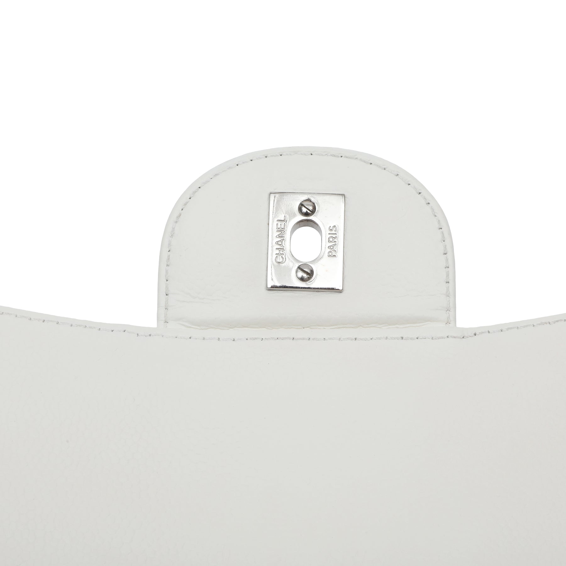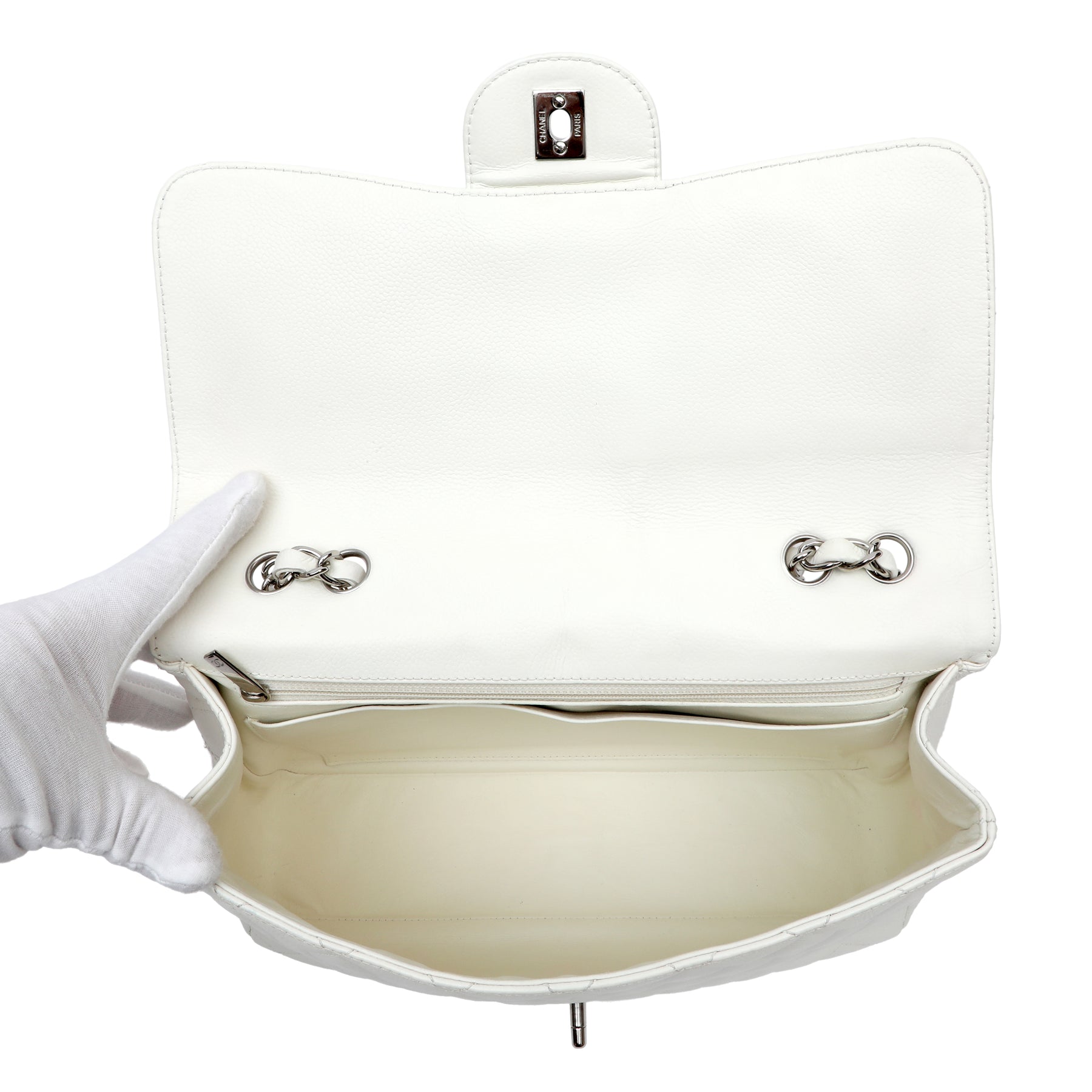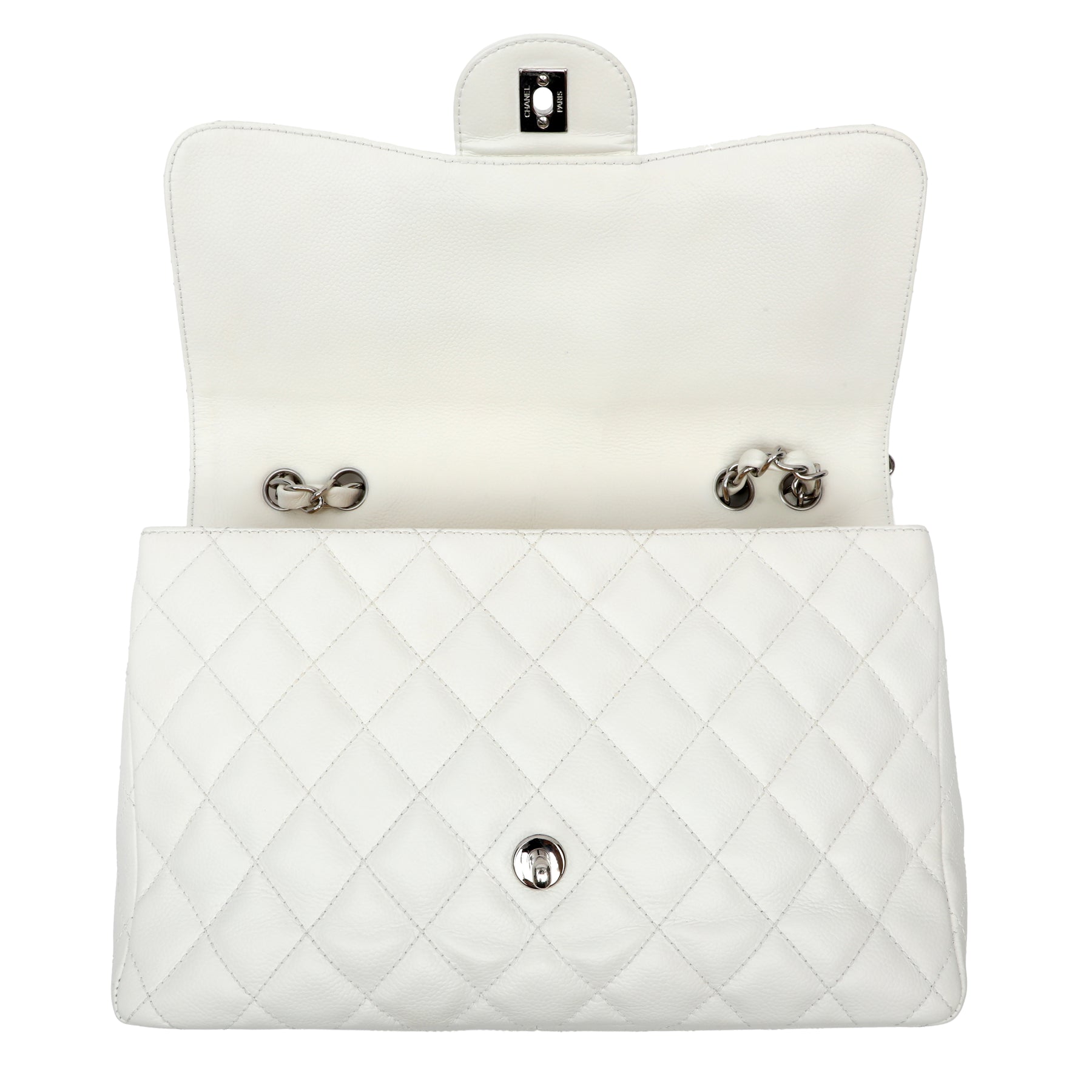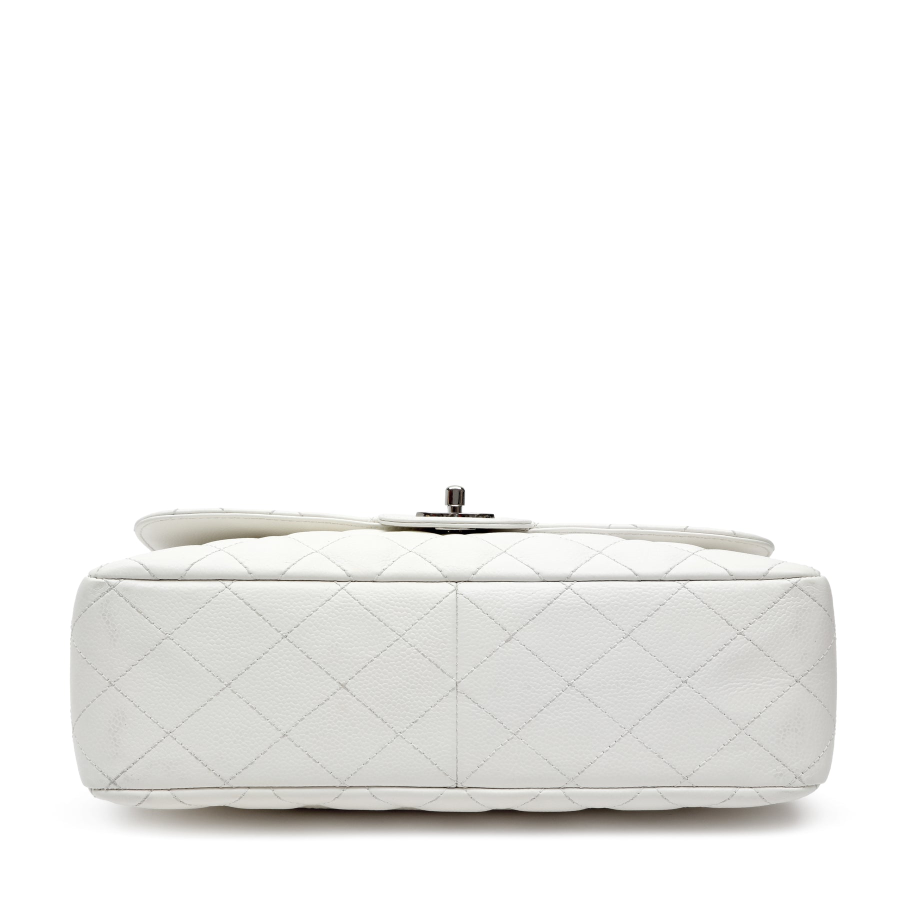 Chanel Classic Single Flap White Jumbo, crafted from smooth white leather in the iconic quilted silhouette. Featuring the timeless CC turn-lock and a spacious interior, this elegant piece offers classic Chanel sophistication with a fresh, refined finish.